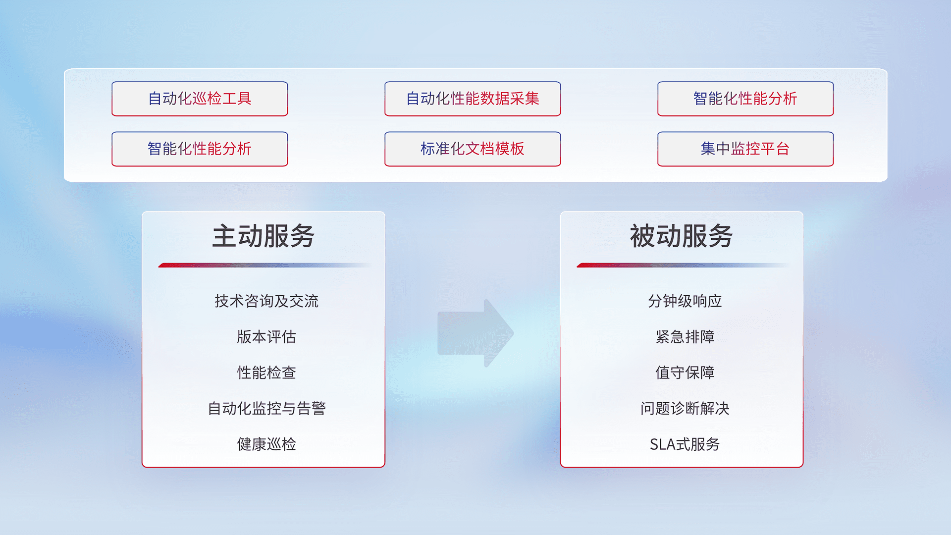 智能化工具和标准化文档,,,,保障服务质量,,,提供主动服务(包含技术咨询、、版本评估、、性能检查、、、、自动化监控与告警、、、健康巡检)和被动服务包含(分钟级响应、、、紧急排障、、、、值守保障、、问题诊断解决、、SLA服务)。。。